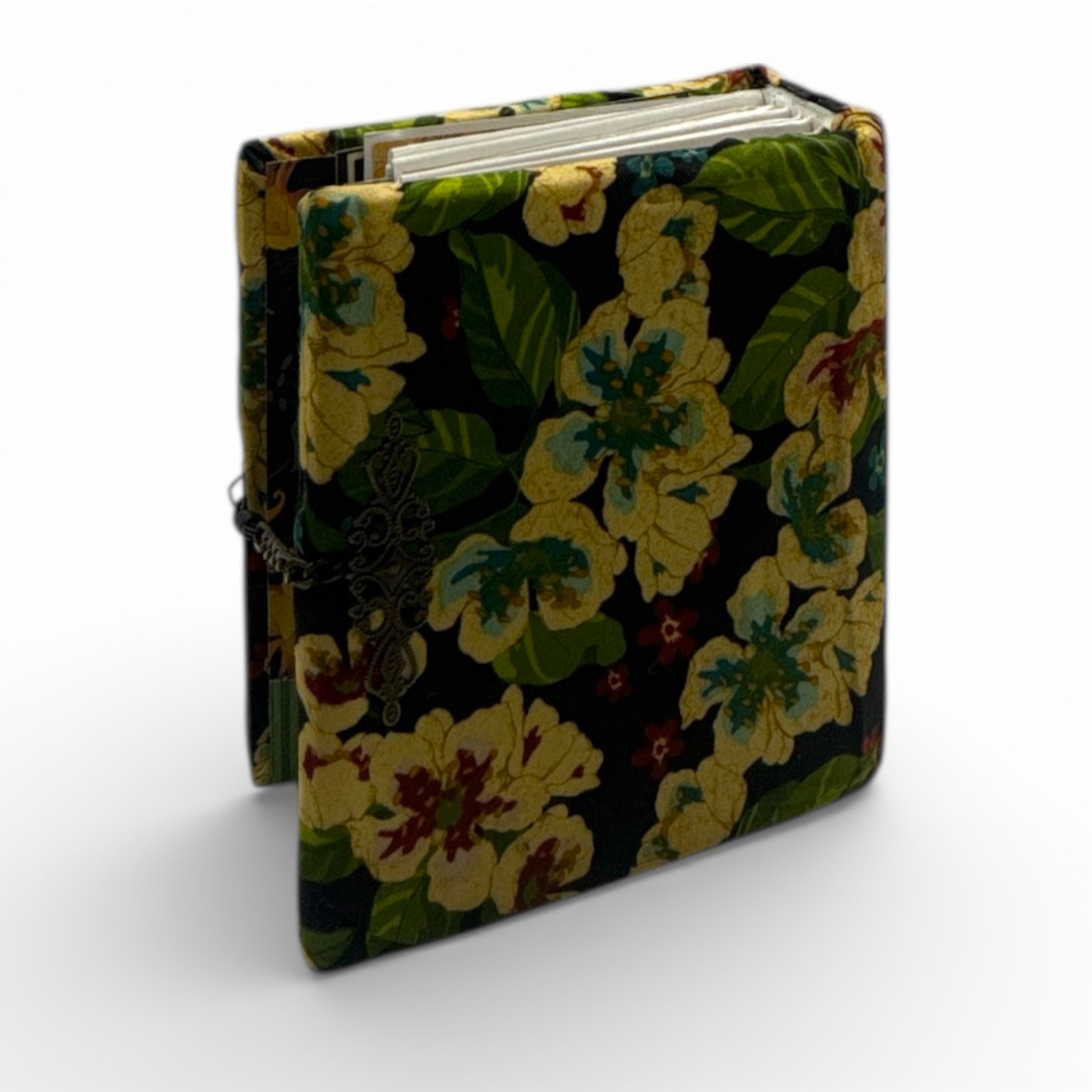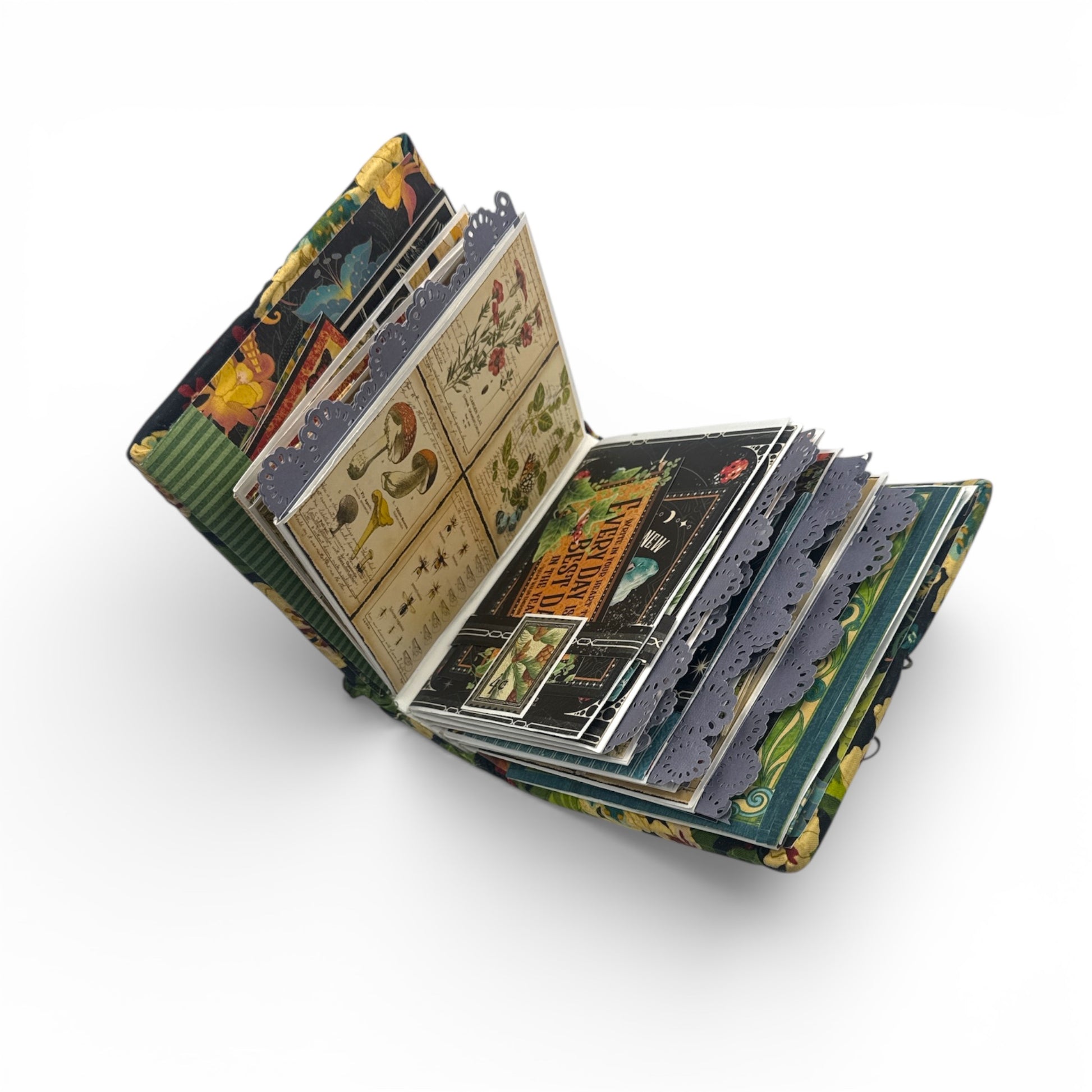 This handmade, unique, one-of-a-kind mini album has been created using flower and butterfly inspired premium crafting papers such as Graphic 45 Life is Abundant and many others and is covered in Graphic 45's Tropical Travelogue collection fabric. It has 8 sleeves/sections with many interactive pages. There is a lot of fussy cut embellishments. It has elegant gems, faux flowers, metal embellishments, clips, frames, envelopes and much more. It measures 6.5"x 6.5“x 4” and weighs approximately 1 pound 4 ounces.