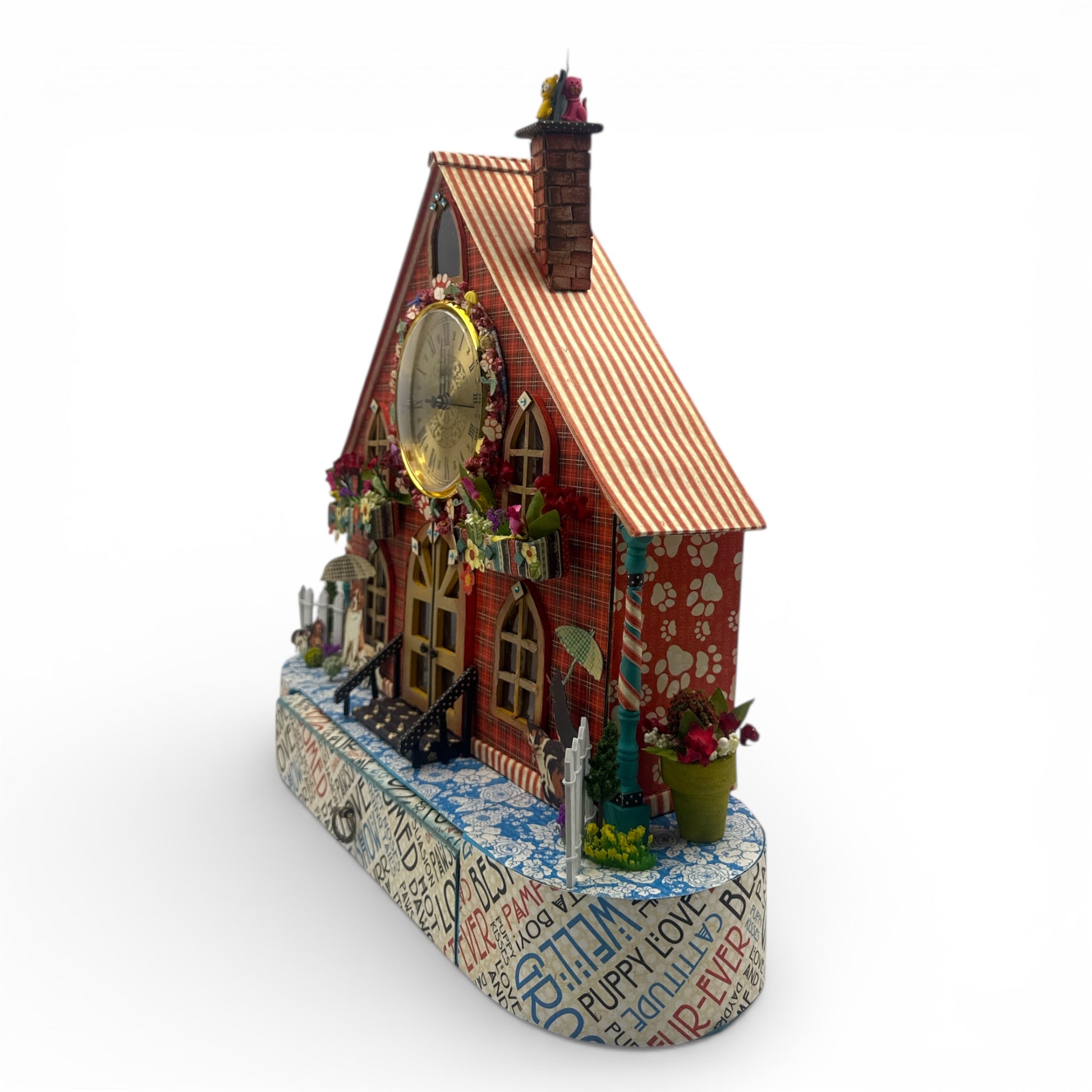 A unique, one-of-a-kind, handcrafted paper creation raining cats and dogs clock house with built-in coordinating, hidden mini book created with Graphic 45's Raining Cats and Dogs and Well Groomed premium paper crafting paper collections and premium embellishments, including lots of fussy cut items. The house includes a working battery-operated clock and battery-operated light to light up the inside of the house. The back of the house has a latched opening to expose the clock mechanism as well as a battery-operated lighting switch. The clock house can either be hung on a wall with an attached hanger on the back or can be a mantle clock. The faux drawer in the front is removable and becomes the hidden mini min album with 3 sections with lots of interactive components for your journaling and photo memory needs. The whole structure measures 16.5” wide x 5" deep x 16.5" high. The entire structure weighs approximately 2.5 pounds.